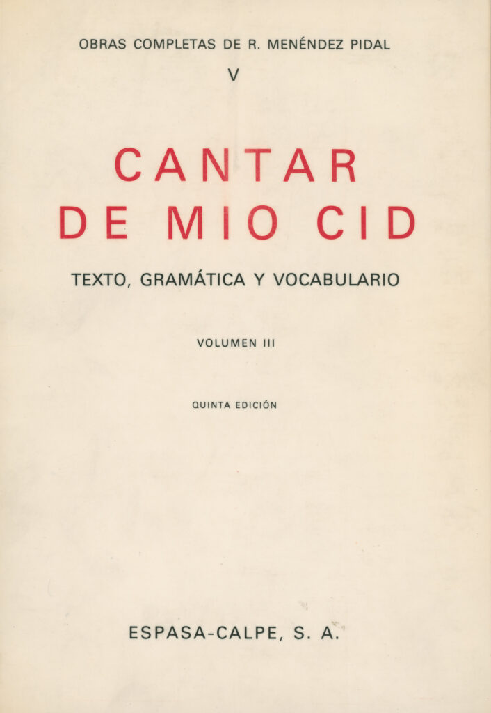 — (ed.) Cantar de Mio Cid. Texto, gramática y vocabulario, 2a ed., Madrid, Espasa- Calpe, t. I. Primera Parte: Crítica del texto; Segunda Parte: Gramática, 1944; t. II. Tercera Parte: Vocabulario, 1944; t. III. Cuarta parte: Texto del Cantar y Adiciones, 1946.