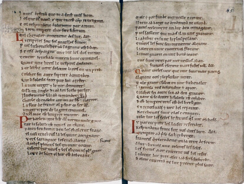 La Chanson de Roland es no solo el poema épico más famoso de la Edad Media, sino también la obra que mayor influencia ha ejercido en el género épico en Francia y en todos los reinos medievales que adoptaron y desarrollaron este tipo de poesía. La versión más antigua de este texto fue compuesta hacia el año 1100 y se conserva en un manuscrito anglonormando copiado hacia 1170 hoy custodiado en la Bodleian Library de la Universidad de Oxford (MS Digby 23). La Chanson de Roland narra, en clave legendaria, los hechos de la mítica batalla de Roncesvalles, que tuvo lugar el 15 de agosto del año 778. En ella las tropas de Carlomagno, al mando de su sobrino Roldán, prefecto de la marca de Bretaña, fueron sorprendidas por una fuerza enemiga. En la batalla, adversa para las tropas carolingias, Roldán pierde la vida, no sin antes hacer sonar su cuerno para avisar a su tío Carlomagno. Inspirado en este o en un poema francés u occitano anterior de temática análoga se compuso, probablemente en el reino de Navarra y en las primeras décadas del siglo XIII, el Cantar de Roncesvalles, un poema épico en verso anisosilábico del que se ha conservado solo un fragmento de 100 versos. Este texto se ha transmitido en dos folios manuscritos copiados a principios del siglo XIV, hoy en el Archivo General de Navarra (ms. 212).
